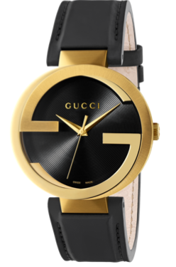 Boîte en PVD or jaune, cadran noir avec sillons, bracelet en cuir noir